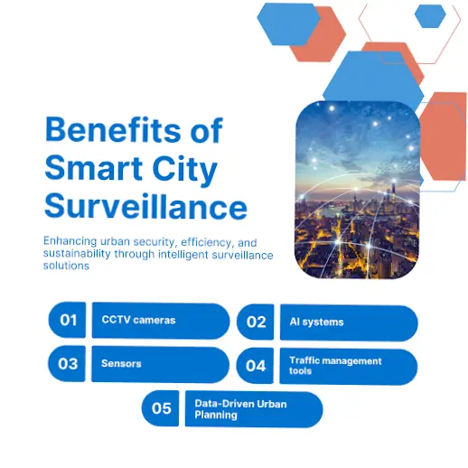 Smart city surveillance systems are designed to make cities safer and more efficient. They include: