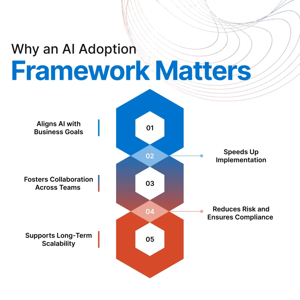 adoption strategy for enterprises. A robust AI adoption framework ensures alignment of AI with business goals, faster implementation, and cross-team collaboration. It also reduces operational risk by enforcing a strong AI governance framework and supports long-term scalability of AI initiatives. With strong executive sponsorship, data readiness, and upskilling of the workforce, this structured approach creates a clear AI implementation roadmap, ensuring enterprise AI strategy success.